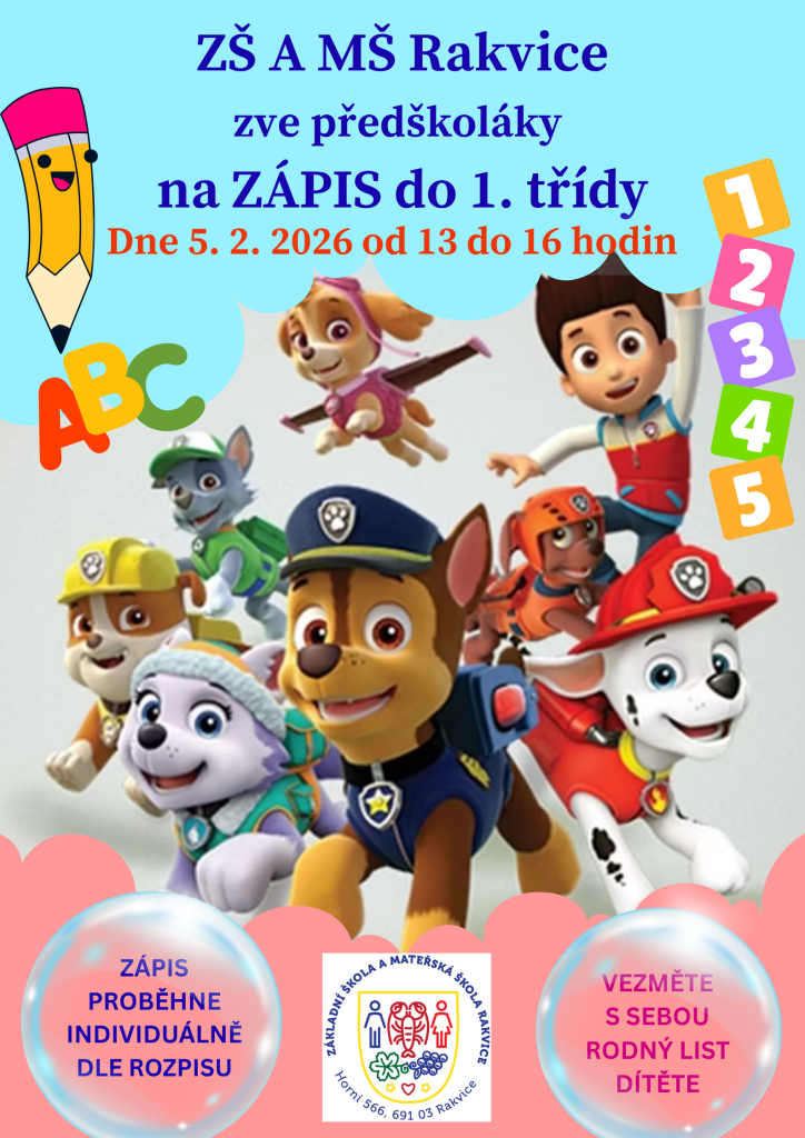 Základní škola a Mateřská škola Rakvice zve všechny předškoláky na zápis do 1. třídy. Akce se uskuteční dne 5. února 2026 od 13 do 16 hodin.