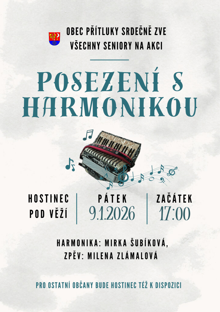 Tradiční akce pro seniory - Posezení s harmonikou proběhne v pátek 9. ledna 2026 v 17 hodin v Hostinci Pod Věží.